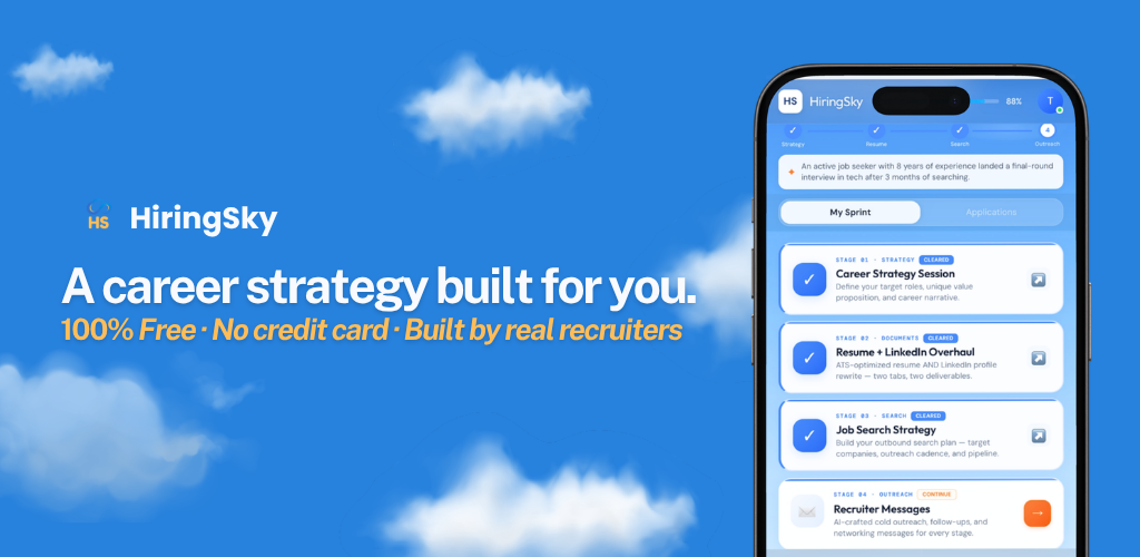HiringSky builds a complete job search strategy from your actual background — not generic templates, not recycled advice. Answer a short questionnaire, and walk away with a career positioning brief, an ATS-optimized resume rewrite, a LinkedIn profile revamp, a targeted search plan with role fit analysis, and recruiter-ready outreach messages written in your voice.