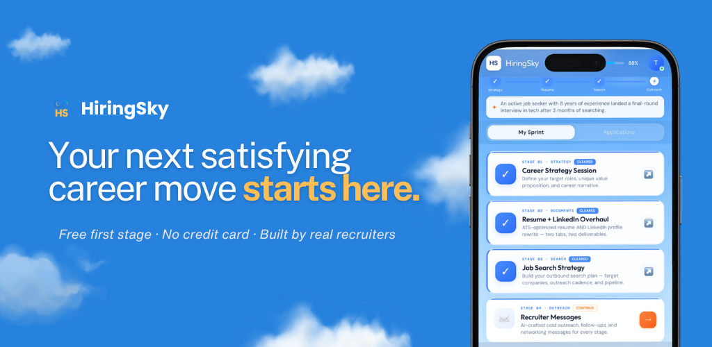 HiringSky builds a complete job search strategy from your actual background — not generic templates, not recycled advice. Answer 15 questions, and walk away with a career positioning brief, an ATS-optimized resume rewrite, a LinkedIn profile revamp, a targeted search plan with role fit analysis, and recruiter-ready outreach messages written in your voice.